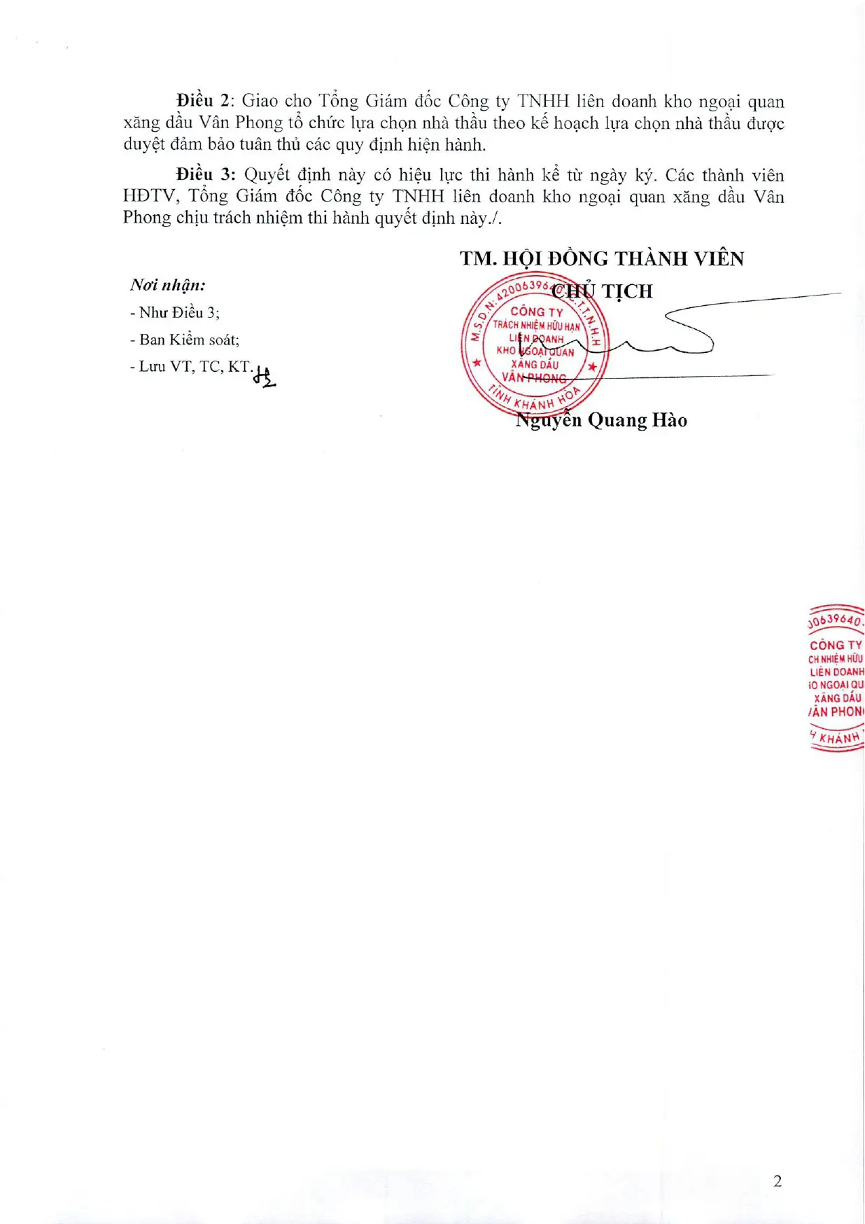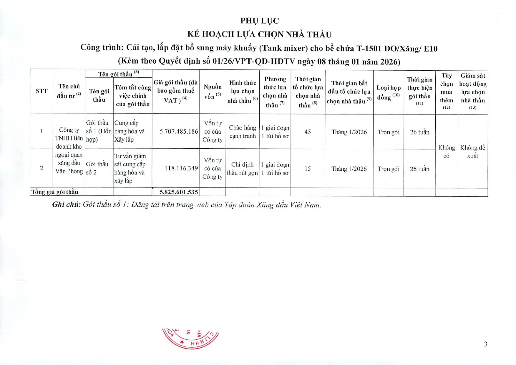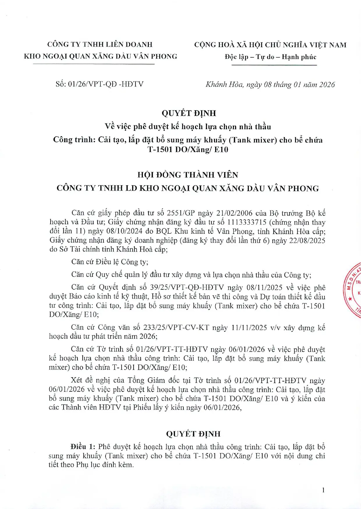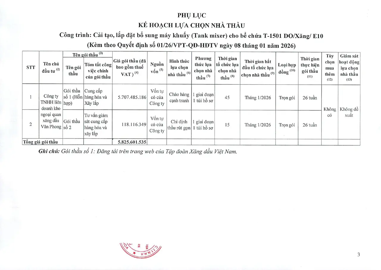 Quyết định HĐTV phê duyệt Kế hoạch lựa chọn nhà thầu, Gói thầu số 1: Cung cấp hàng hóa và xây lắp" Thuộc kế hoạch lựa chọn nhà thầu: Cải tạo, lắp đặt bổ sung máy khuấy (Tank mixer) cho bể chứa T-1501 DO/Xăng/E10
